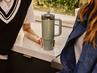 Our newest FlowState™ Quencher H2.0 Tumbler collection is constructed of 90% recycled stainless-steel metal. The advanced FlowState™ lid includes silicone gaskets that help prevent leaks when the reusable straw is in place or the rotating cover is closed. However, these travel tumblers are not fully leakproof. The 30-oz and 40-oz sizes feature an ergonomic, comfort-grip handle for easy carrying. All FlowState™ Quencher H2.0 Tumblers are compatible with car cup holders.