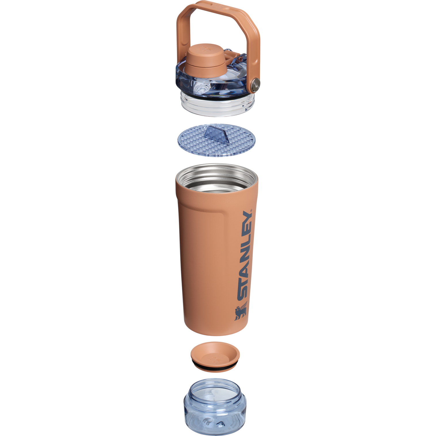 The 20-ounce Activate Shaker Bottle keeps your drink cold for hours, thanks to double-wall vacuum insulation. A rounded interior makes mixing and cleaning easy, while the fast flow spout provides a better sip. The inside is stamped with measurement lines and includes a removable strainer. The base storage container and the soft, easy-grip handle are great for on the go. And with a leakproof Tritan lid, it’s ready to toss in your bag.