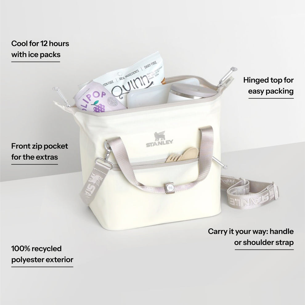 With a 10-can storage capacity, the All Day Julienne Mini Cooler keeps your goods nice and cool for 12 hours. The unique “doctor’s bag” hinge top pops open to help with unpacking. Load up with reusable ice packs, pop it shut and the sturdy zipper keeps things safely stored. The snap-top handles have a comfortable grip, while a zippered pocket protects your valuables. There’s also the option to attach the strap to sling the cooler over your shoulder. From acai bowls to charcuterie, sparkling beverages and wine are ready to be enjoyed. Don’t forget to pack all your favorite snacks and drinks in Stanley style.