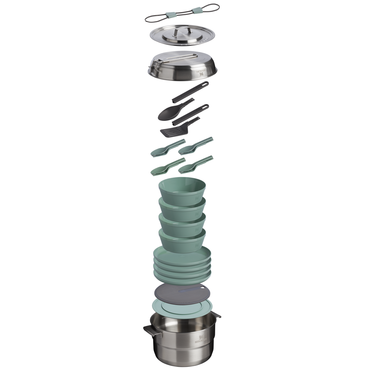 The Wildfare Core Fry Pan Cookset is a fully stocked kitchen, packed up neatly to go. This 26-piece set includes a 4-quart pot, 8-inch tri-ply fry pan, cooking utensils, and nonslip cutting board with a removable trivet. The four-person tableware set includes high-walled plates, stacking bowls, and dual-end cutlery for outdoor hosting with the comfort of home.